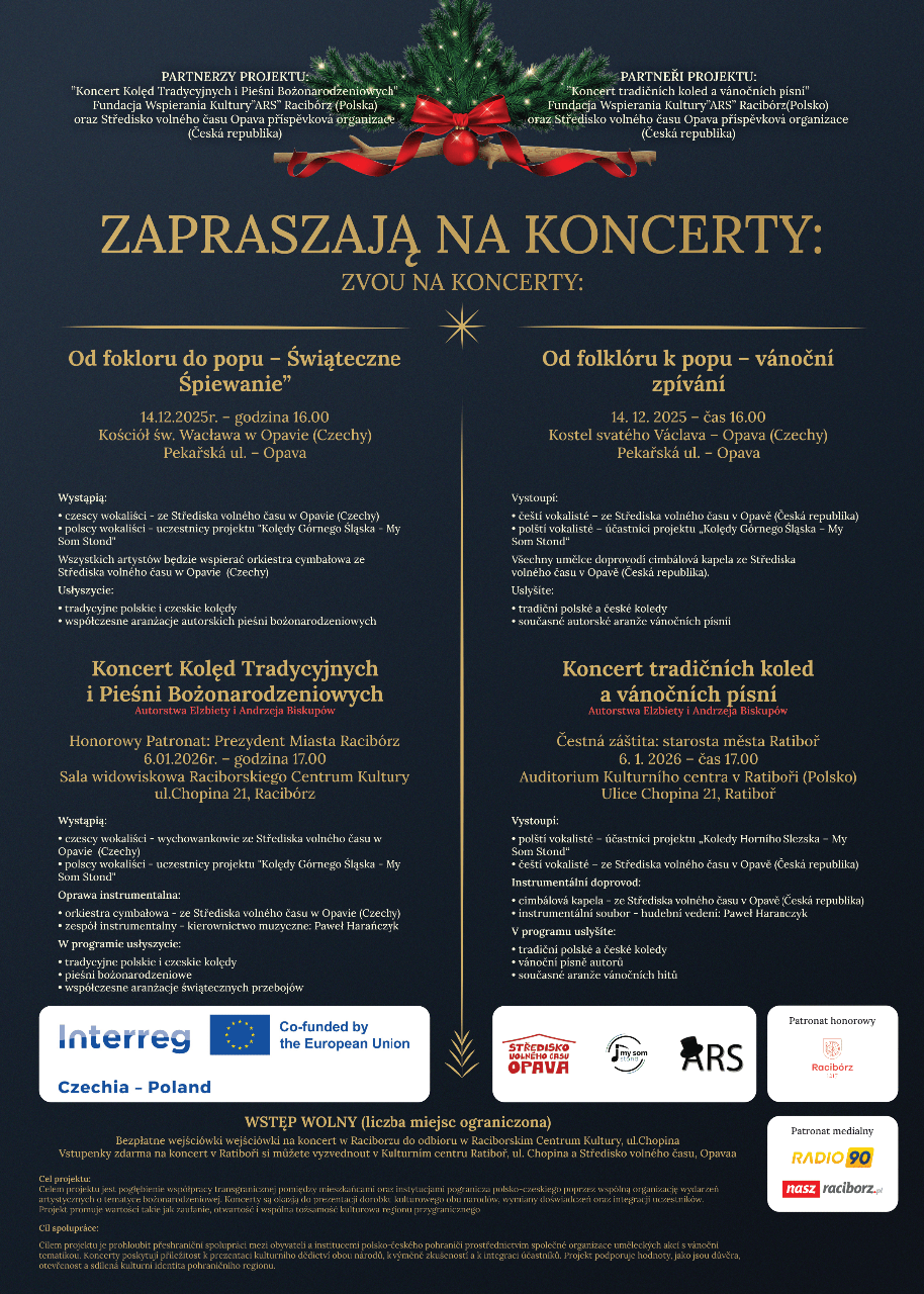Měli jsme tu čest být součástí polsko-českého projektu, který prostřednictvím tradiční i moderní hudby propojil minulost se současností. Projekt byl zaměřen na společné uchovávání a rozvíjení vánočních hudebních tradic a vyvrcholil dvěma slavnostními koncerty v Opavě a Ratiboři. Do projektu se zapojila Fundacja Wspierania Kultury „ARS“ z Ratiboře a Středisko volného času Opava prostřednictvím dětského folklorního souboru Úsměv.